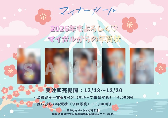マイナーガールから感謝の気持ちを込めた直筆メッセージ&宛名入り年賀状を元旦予定でお届け! 浅草での撮り下ろし着物姿のマイガルちゃんと是非一緒に素敵な新年を迎えてください♡ 全員から一言&サイン(グループ集合写真) ¥4,000 / 1枚 ※配送状況により元旦からずれ込む可能性がございます。 ※こちらの商品は受注生産商品です。お客様都合でのキャンセルは出来ません。 ※支払い期限切れでのキャンセルになった場合、もう一度購入していただく場合がございますのでご了承ください。 ※サインやコメント、メッセージの量につきましては、メンバーの裁量により対応させていただきます。 ※ご購入時に書いて欲しいお名前を備考欄に入力してください。 Xなどのユーザーネームでも可能です。記入がない場合は本名となります。
